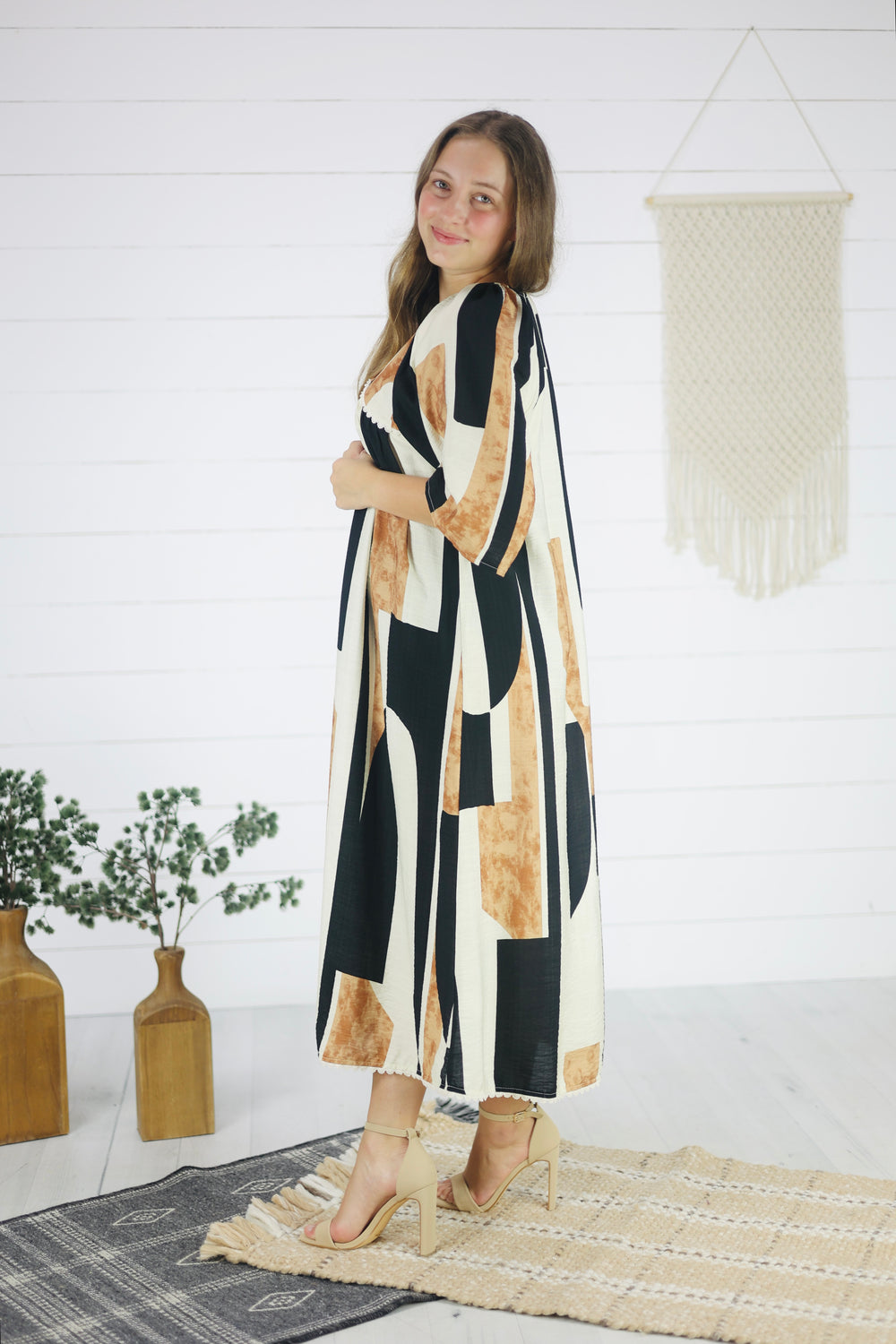 Step into effortless style with the Carmen Abstract Dress in Black. This loose-fit, midi-length dress features a playful abstract print and a breezy, unlined design perfect for warm days. The flattering V-neck, measuring approximately 9 inches, adds a touch of charm while keeping it bump-friendly for expecting mamas. Whether you're out for brunch or a casual stroll, this dress combines comfort and creativity with a fun, relaxed vibe.