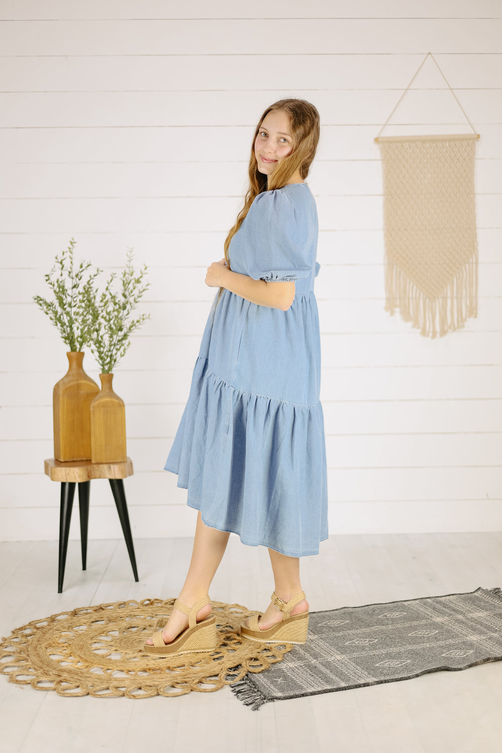 Make a statement in the Lauretta Midi Dress! This light denim dress features a tiered, hi/low hem and hidden pockets, making it both stylish and functional. Plus, it's baby bump friendly for all you mamas-to-be. Perfect for any occasion, this dress will take you from day to night with ease. Keyhole 5"