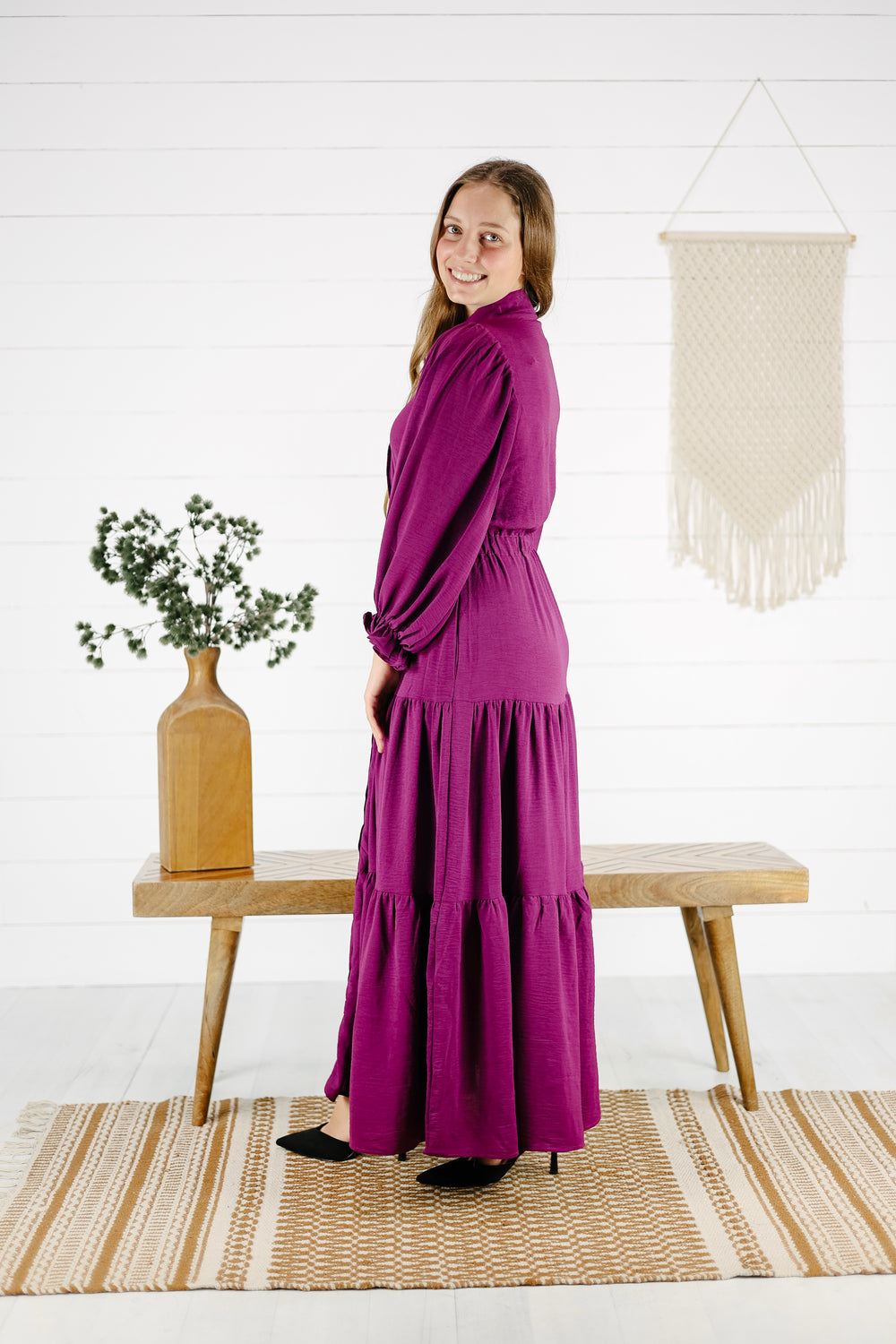 Effortlessly stylish and functional, the Bonnie Maxi Dress in Magenta is a must-have for any wardrobe. Featuring a collared neckline and 3/4 sleeves, this dress is perfect for fall occasions. With functioning buttons, hidden pockets, and a stretch waist for comfort, it's both stylish and practical. Tiered for a flattering fit and in a dramatic maxi length.