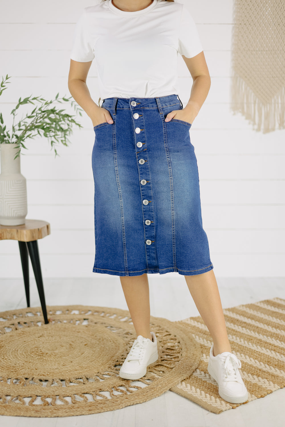 Add a touch of edginess to your wardrobe with our Denali Denim Skirt in Indigo. Featuring distressed detail, functioning buttons, and pockets, this skirt is both stylish and practical. It's perfect for all-day wear. Elevate your denim game today!