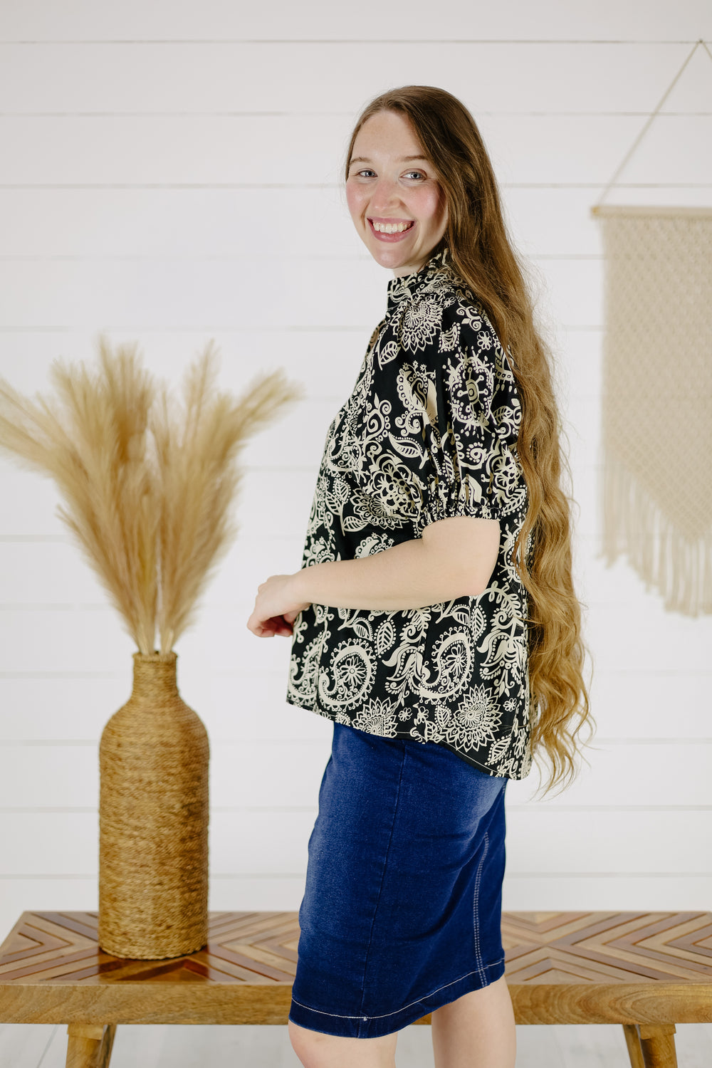 The Elodie Top in timeless black, featuring cinched puff sleeves and dainty ruffle detail on the neckline. Stand out with its bold pattern!