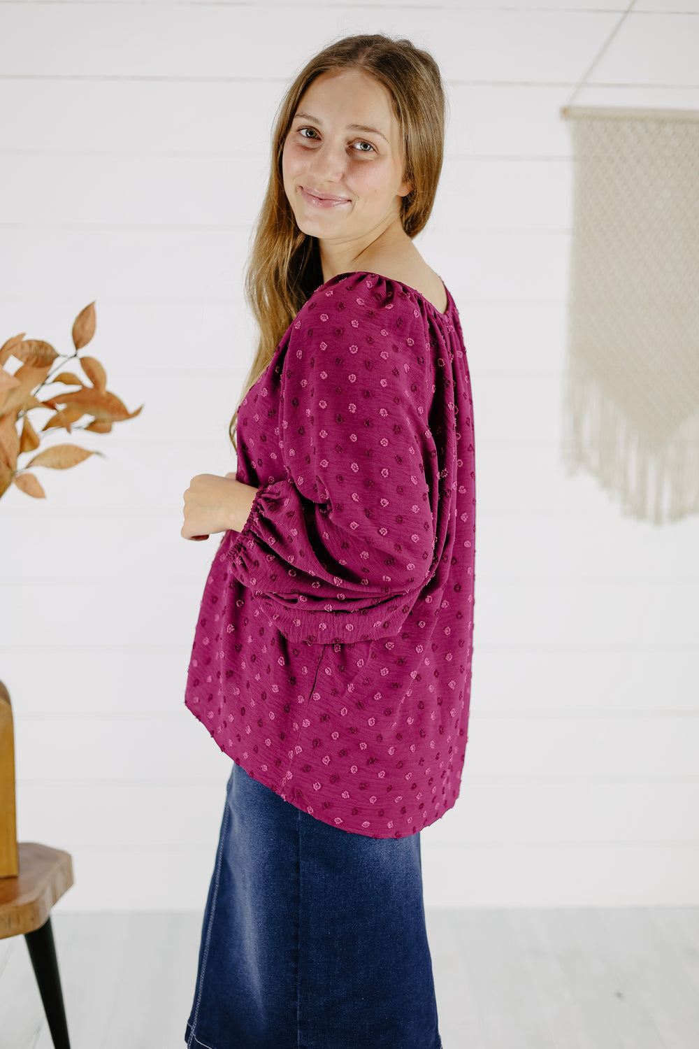 Stand out with our Fiona Textured Top! Its loose fit and dolman sleeves provide a comfortable and stylish look, while the raised dot texture adds a touch of playfulness. Perfect for any occasion, this top will be sure to make a statement.
