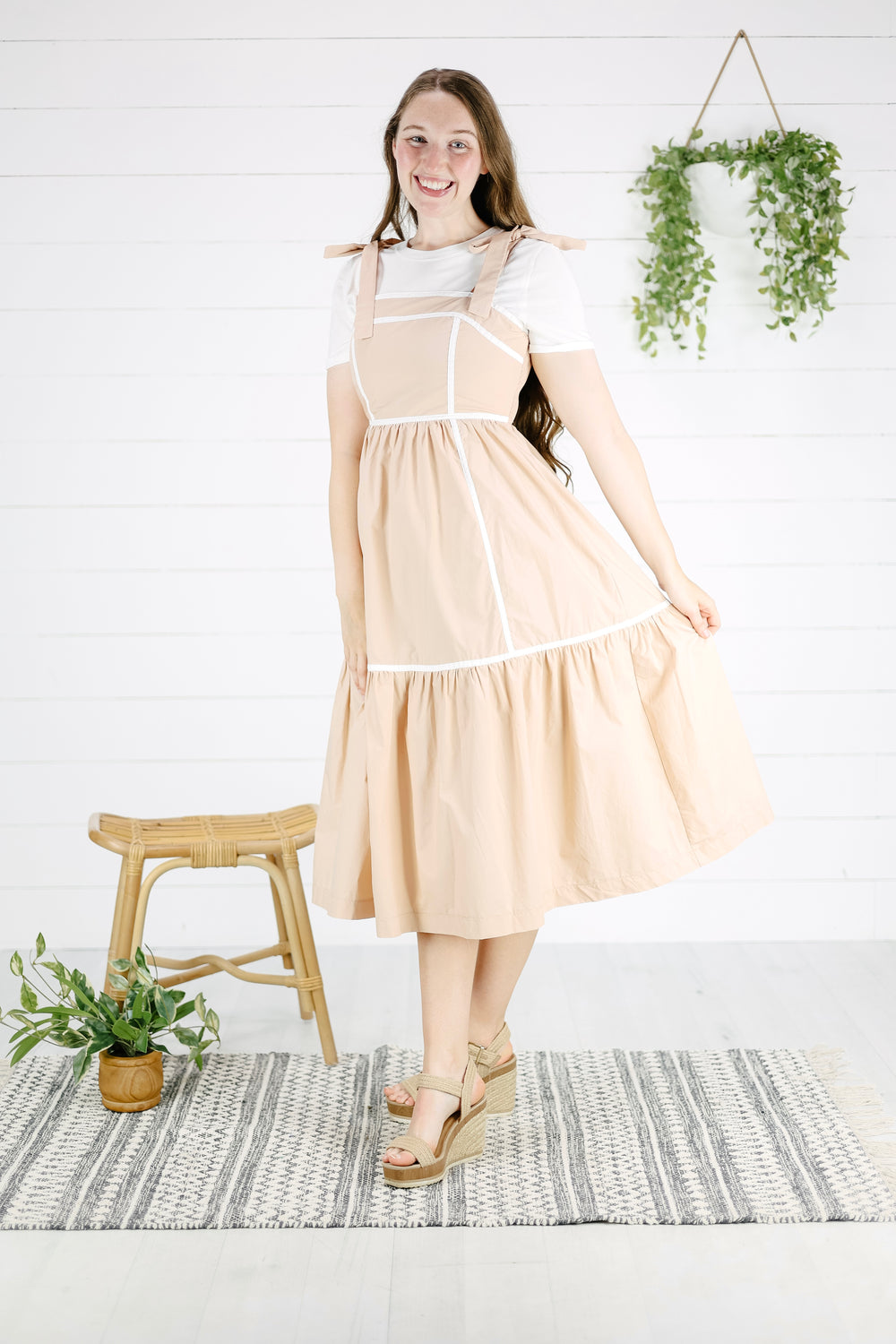 Introducing the Gabi Jumper Dress. This midi dress features hidden pockets for all your essentials, and adjustable straps for the perfect fit. The stretch back makes it comfortable for all-day wear.