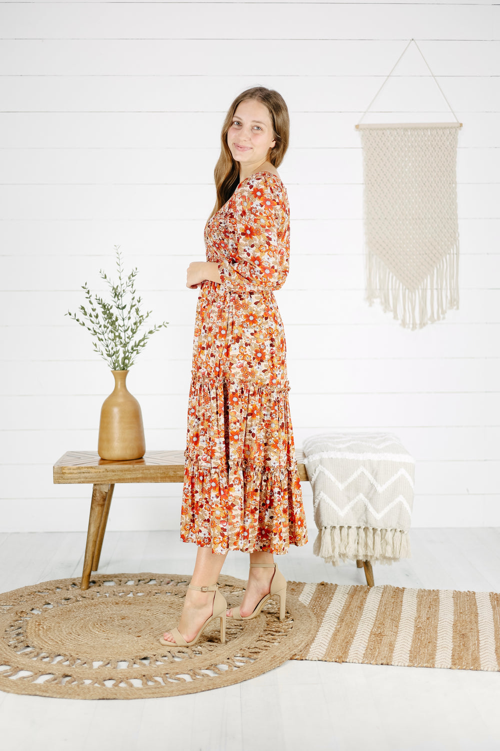 Stay effortlessly chic and playful in the Jemma Print Midi Dress. Featuring hidden pockets, a smocked top, and tiered design, this dress offers both style and functionality. With a half lining and 3/4 sleeves, you'll be comfortable all day long. Plus, the back key closure (approximately 4 inches) adds a touch of whimsy. Perfect for any occasion!