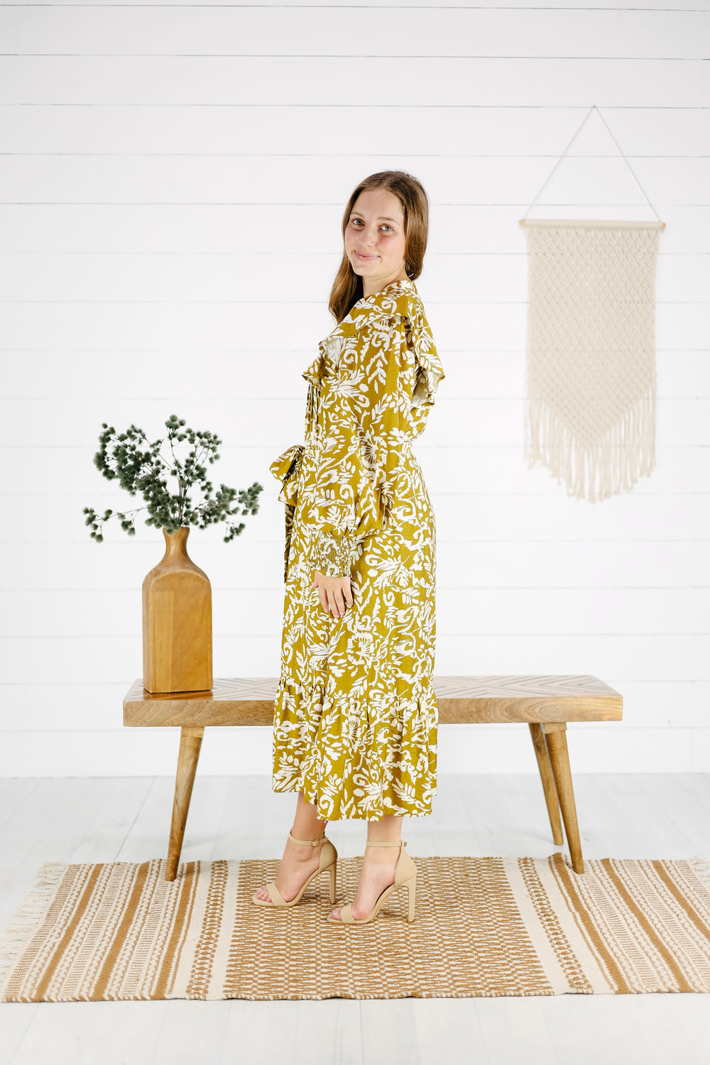 Get ready to turn heads in the Louisa Midi Dress! This stunning Mustard dress features functional front buttons and a tie waist for a flattering silhouette. With hidden pockets and a half lining, it's not only stylish but also practical. The nursing-friendly design and midi length with ruffle detail make it perfect for any occasion. (Fashion meets functionality with this dress!)