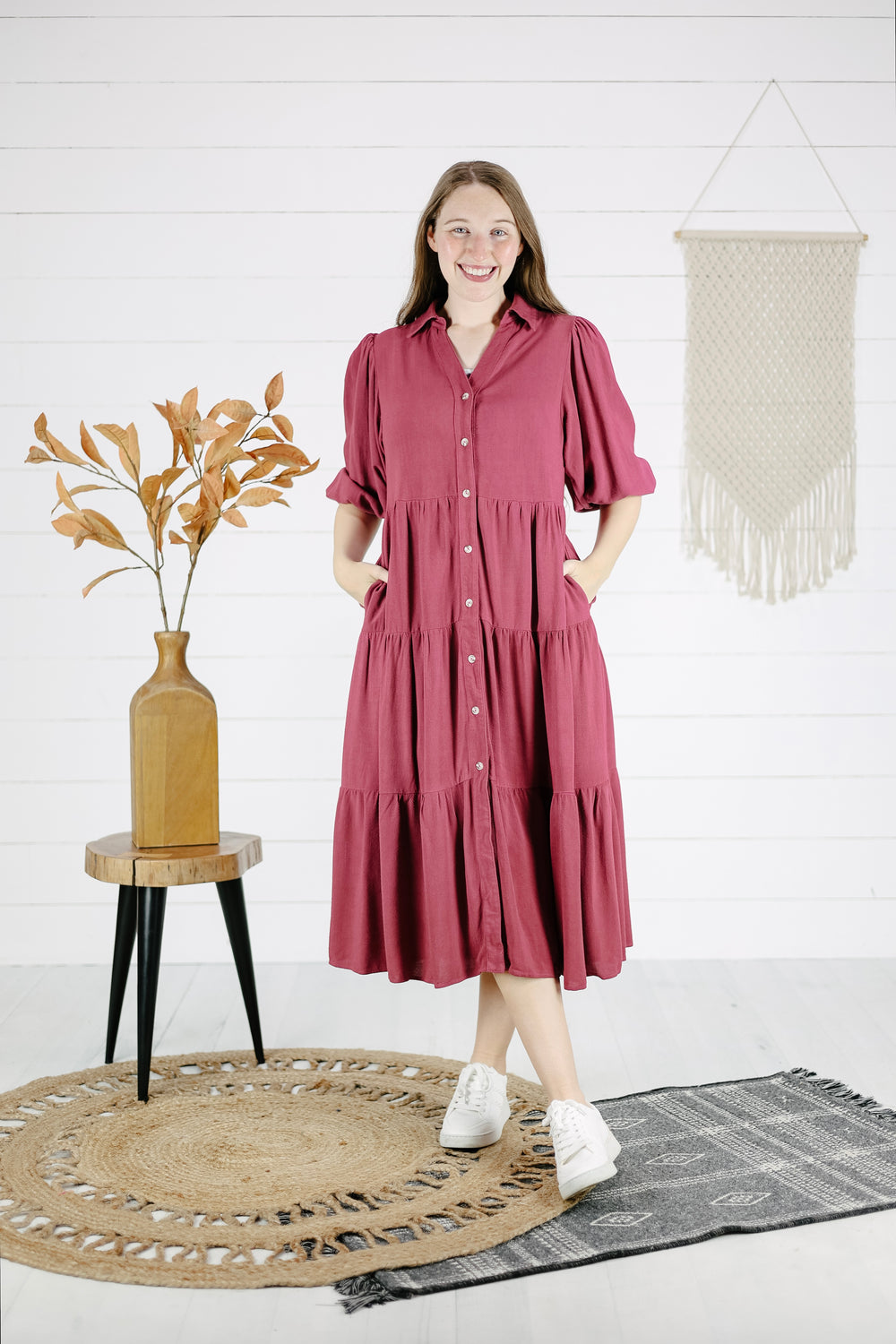Introducing the Olivia Midi Dress! Featuring functioning buttons, a collared neckline, and tiered design, this dress is both stylish and practical. Plus, hidden pockets provide a convenient place to store your essentials. Say goodbye to boring dresses and hello to ultimate style and comfort.