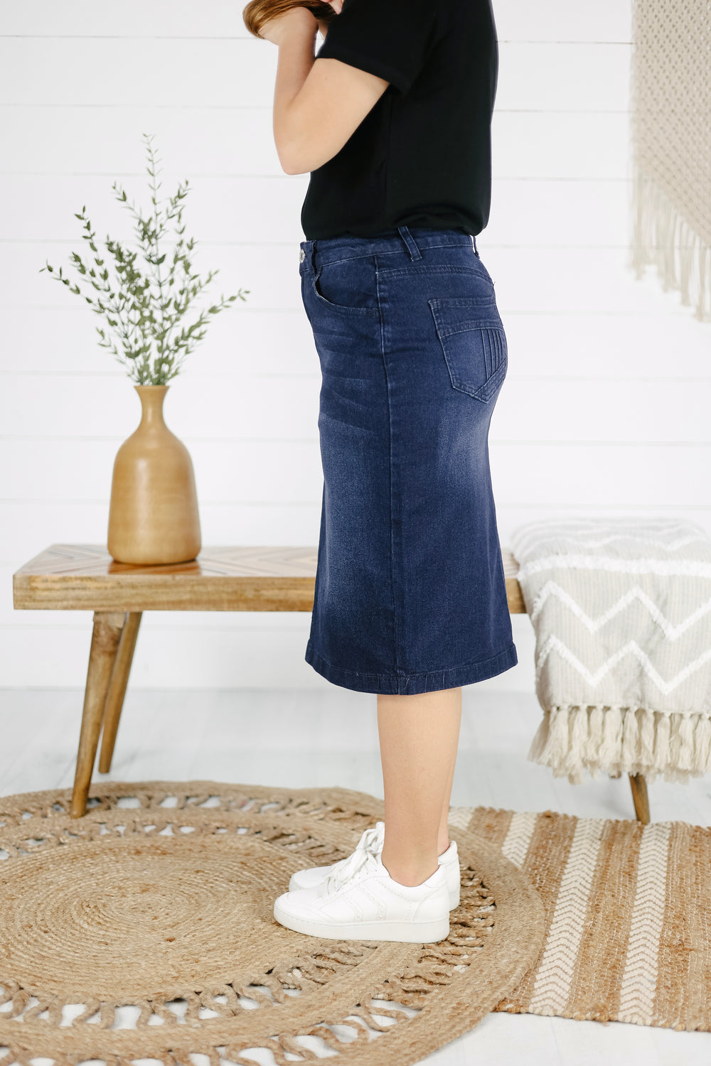 Get ready to show off your playful side in the Jamison Denim Skirt. With its stretchy denim and 5 pocket design, this skirt is as comfortable as it is stylish. The distressed details and zipper button front add a touch of edge to the classic pencil silhouette. Perfect for any occasion!