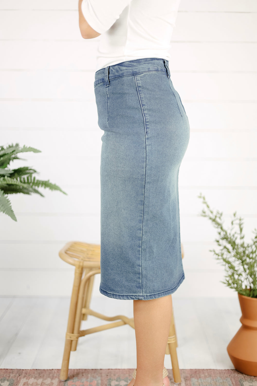 The Teryn Denim Skirt is a stylish and timeless design. Crafted from high quality denim with a hint of stretch for extra comfort, this skirt is complete with a back zipper closure for a secure fit. Perfect for everyday or special occasions, its classic silhouette will flatter a variety of looks.