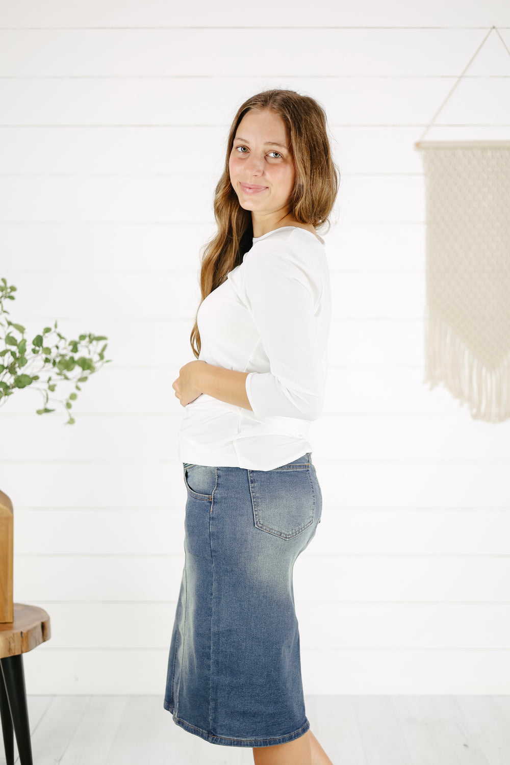 Show off your modest style with the Jessa Layering Top. Crafted from stretchy material, this layering top features 3/4 sleeves for a modern look.