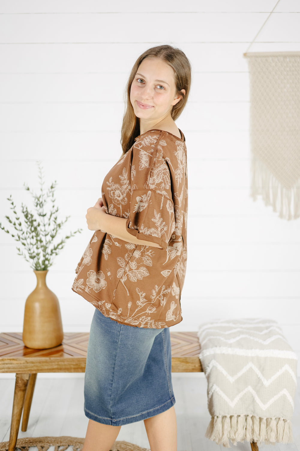 Introducing our Karson Floral Top in brown! Perfect for your everyday adventures, this top offers a loose fit for ultimate comfort. Its soft fabric will have you feeling like you're wearing your favorite pajamas, while still looking effortlessly put together. Grab yours now and get ready to conquer the day!